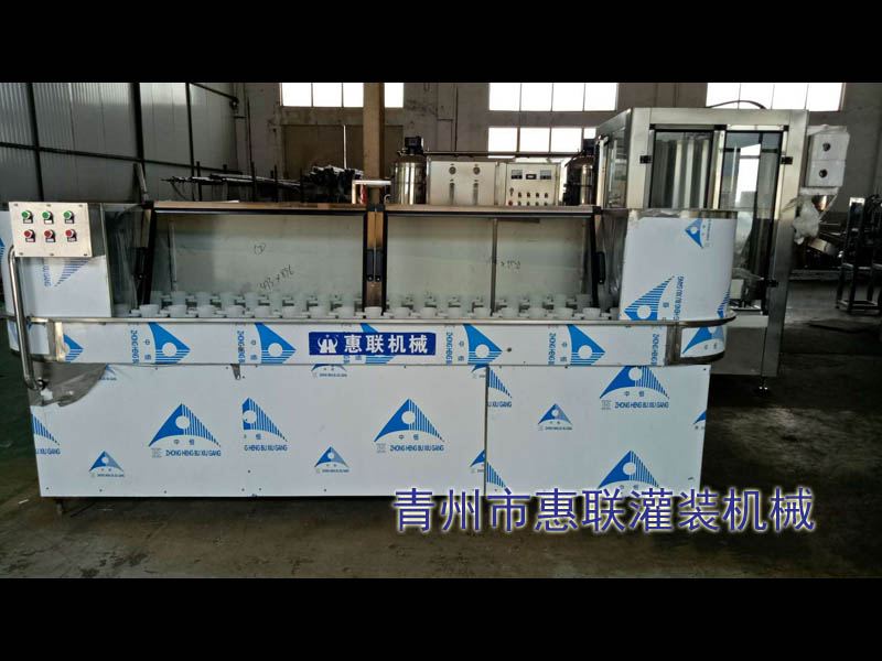 JCK-3000間歇式洗瓶機(jī)采用間歇式?jīng)_洗,沖洗次數(shù)為三次,可分為:粗水→消毒液→凈水;沖洗時間為24秒,生產(chǎn)能力3000瓶/時,該機(jī)配有兩個循環(huán)水箱,二臺加壓泵及過濾設(shè)備。消毒液、凈水可循環(huán)使用,還可在末級潔凈效果,是目前各企業(yè)沖洗設(shè)備更新?lián)Q代的產(chǎn)品。